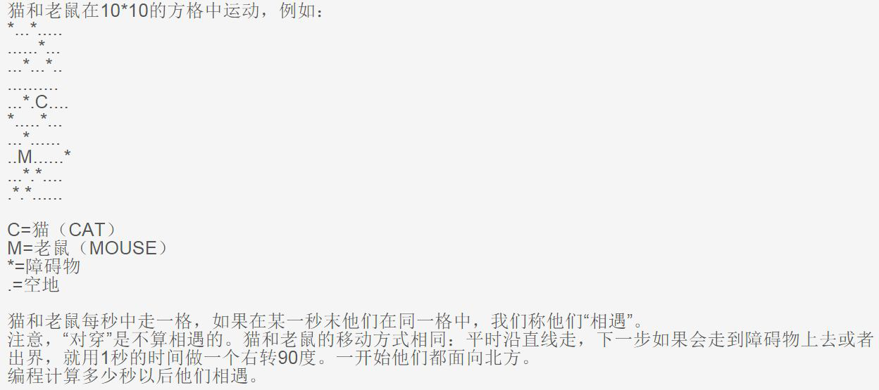 注意,“对穿"是不算相遇的。猫和老鼠的移动方式相同:平时沿直线走,下一步如果会走到障碍物上去或者出界,