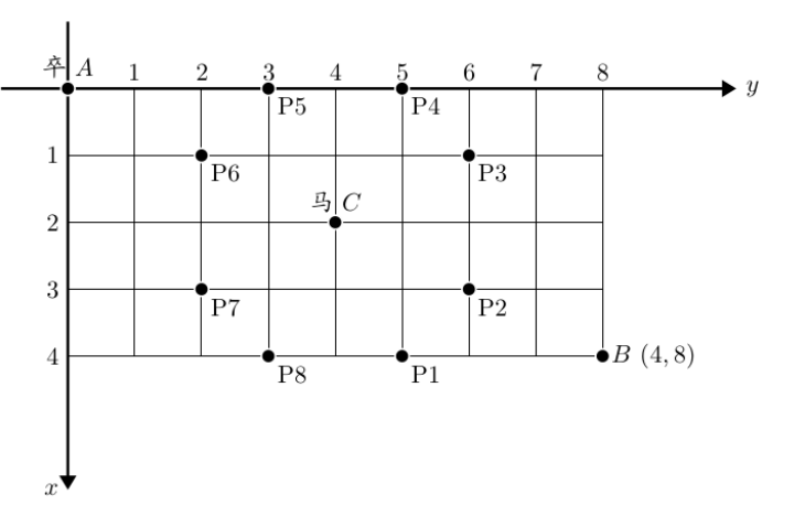 棋盘用坐标表示,A 点 (0,0)、B 点 (n,m),同样马的位置坐标是需要给出的。