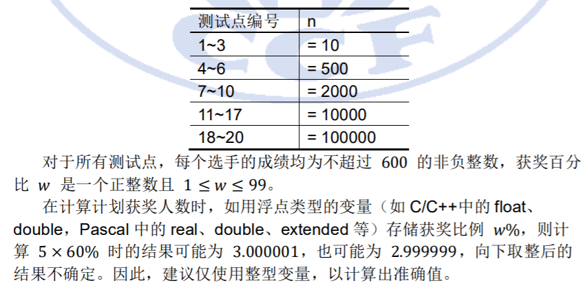 更具体地,若当前已评出了p个选手的成绩,则当前计划获奖人数为max(1,[P×w%])//向下取整,其中w是获奖百分比,[x]表示对x向下取整,max(x,y) 表示x和y中较大的数。如有选手成绩相同,则所有成绩并列的选手都能获奖,因此实际获奖人数可能比计划中多。