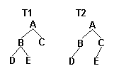 例:如下图中的二叉树T1是对称的,T2是不对称的。